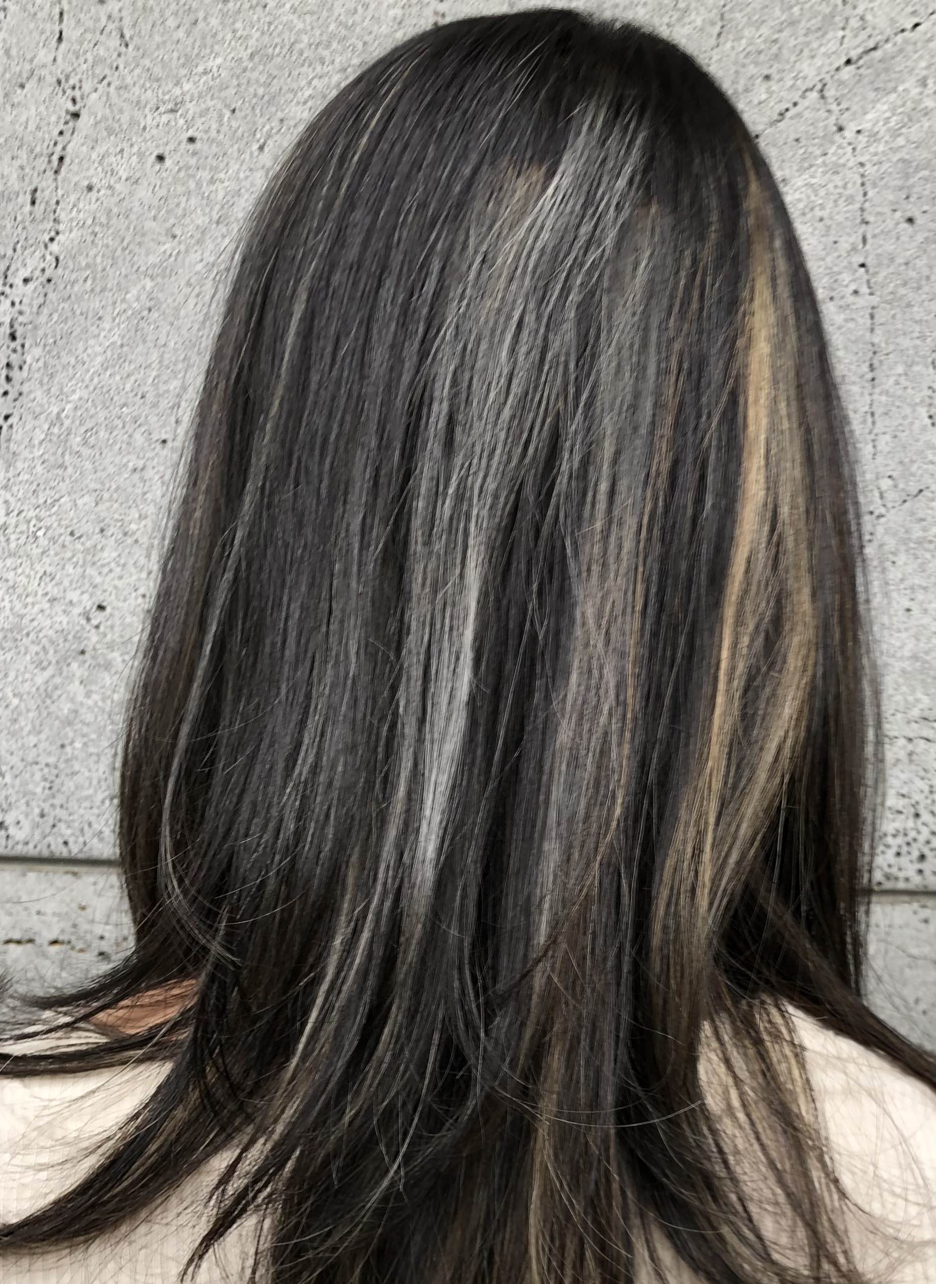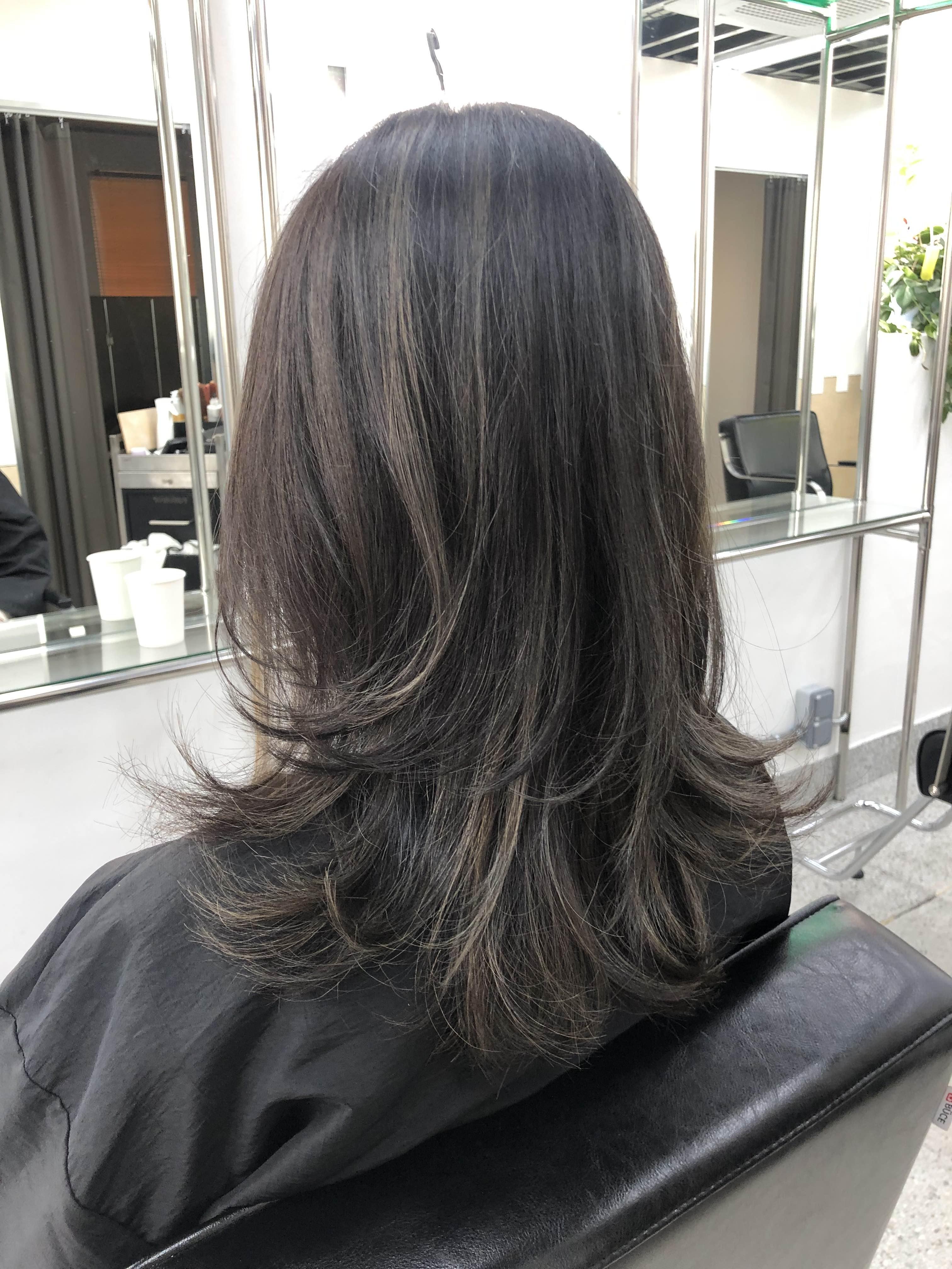 (왼쪽: 한달 후) 거의 한두달만에 애쉬 컬러는 다 빠져버리고, (오른쪽: 3-4달 후) 몇 달 후 검은 머리가 자라면서 탈색된 모발과 새로 자란 머리가 자연스럽게 그라데이션처럼 어우러지면서 노란끼는 잡아주도록 보색 샴푸를 꾸준히 써서 관리하는 게 중요하다.