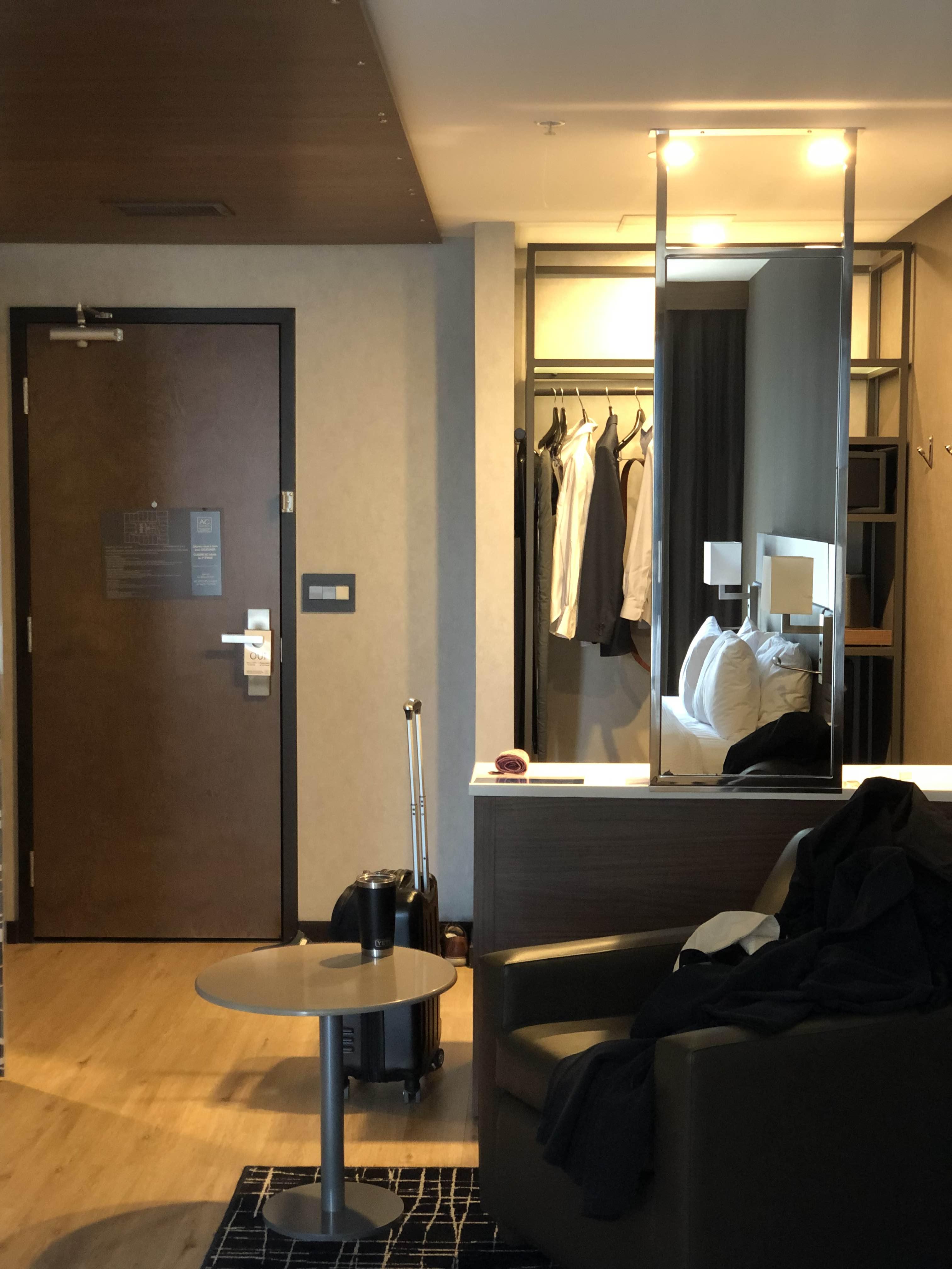 룸 안쪽에서 문 쪽으로는 이런 모습. 매끈한 바닥 다음으로 좋았던 건 네스프레소 머신에 캡슐커피가 놓여있었던 점. 전날 호텔 커피가 워낙 맛이 없었던 터라 이 부분은 정말 안심이었다.