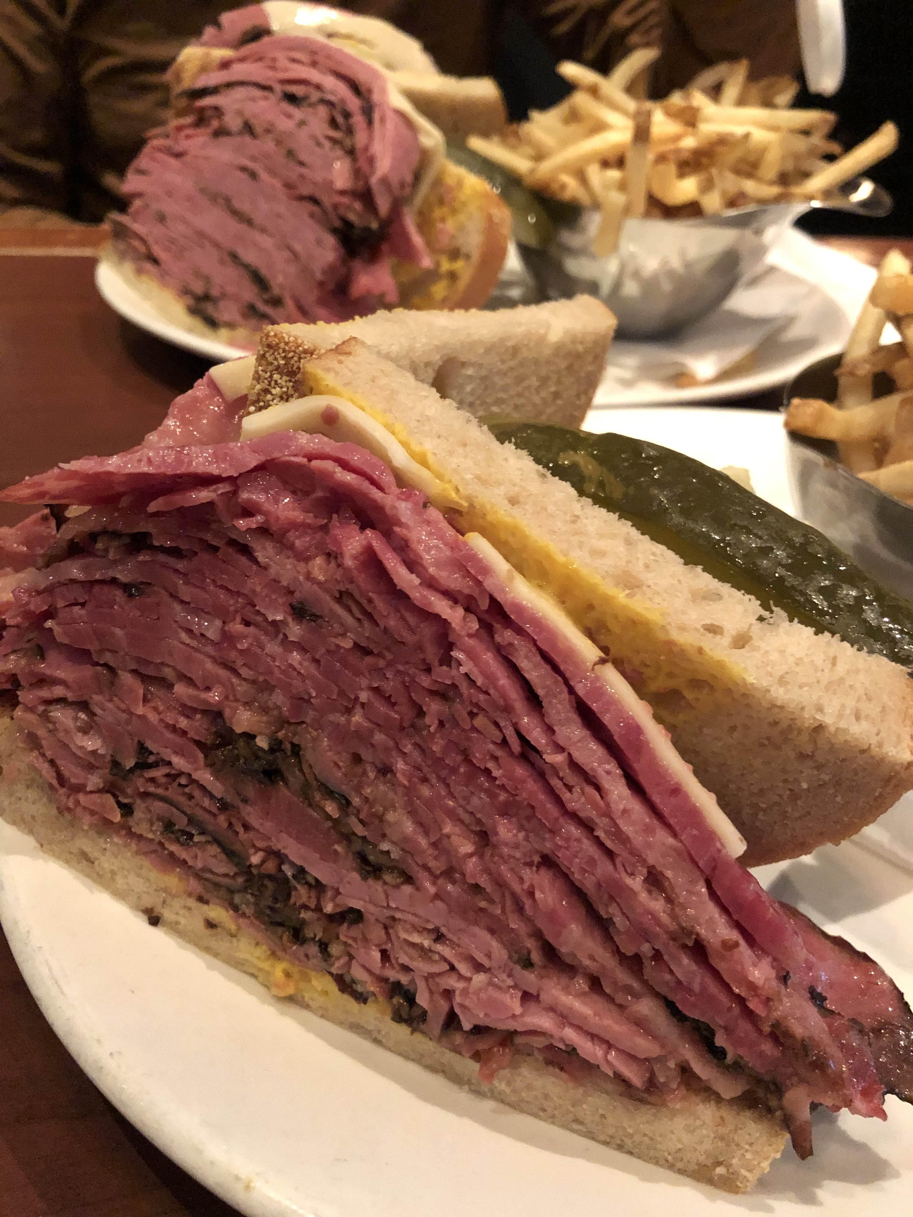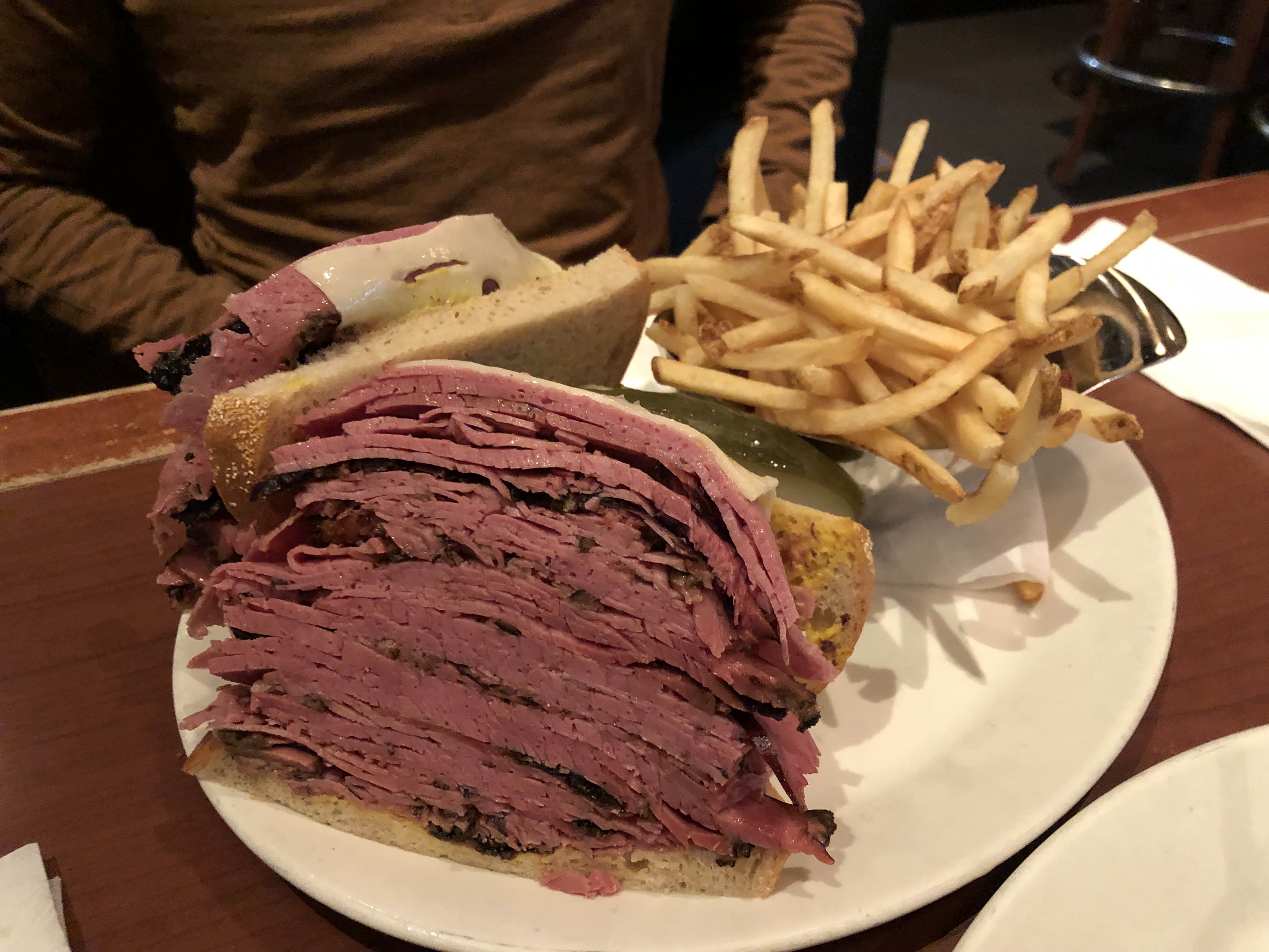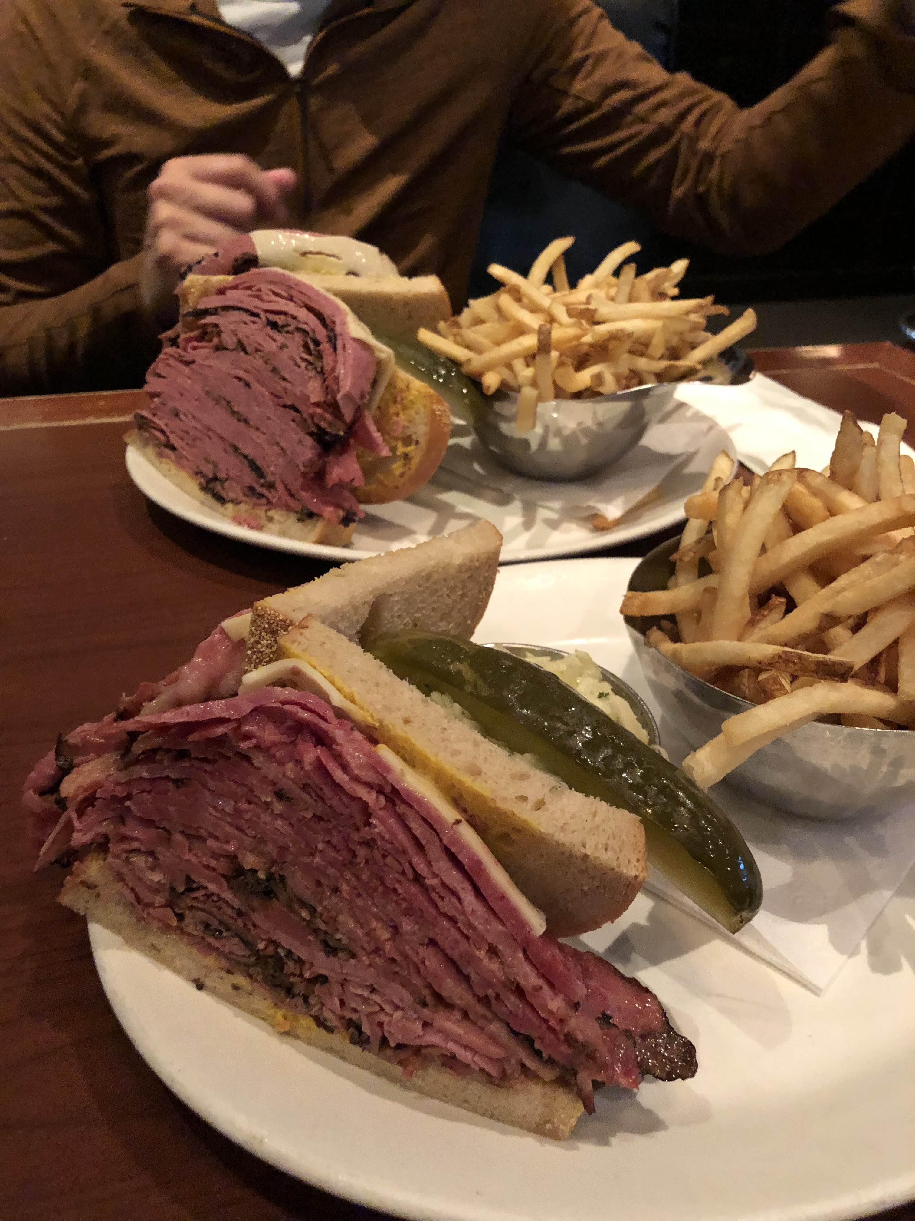 그렇게 샌드위치가 도착했고... 내꺼는 보통 사이즈, V는 조금 더 큰 사이즈로 주문했는데 양이 어마하게 많아 보였당..... 우리는 이미 어니언 수프로 어느정도 배가 채워졌는데 나는 샌드위치를 받자마자 살짝 부담스러웠다. 예전에 슈왈츠에서도 한번 먹어봤지만, 너무 고기만 들어가 있는 샌드위치라 어어엄청 맛있었다는 느낌은 없었고 그냥 한번 먹어봤으니 됐다란 느낌이었던지라...