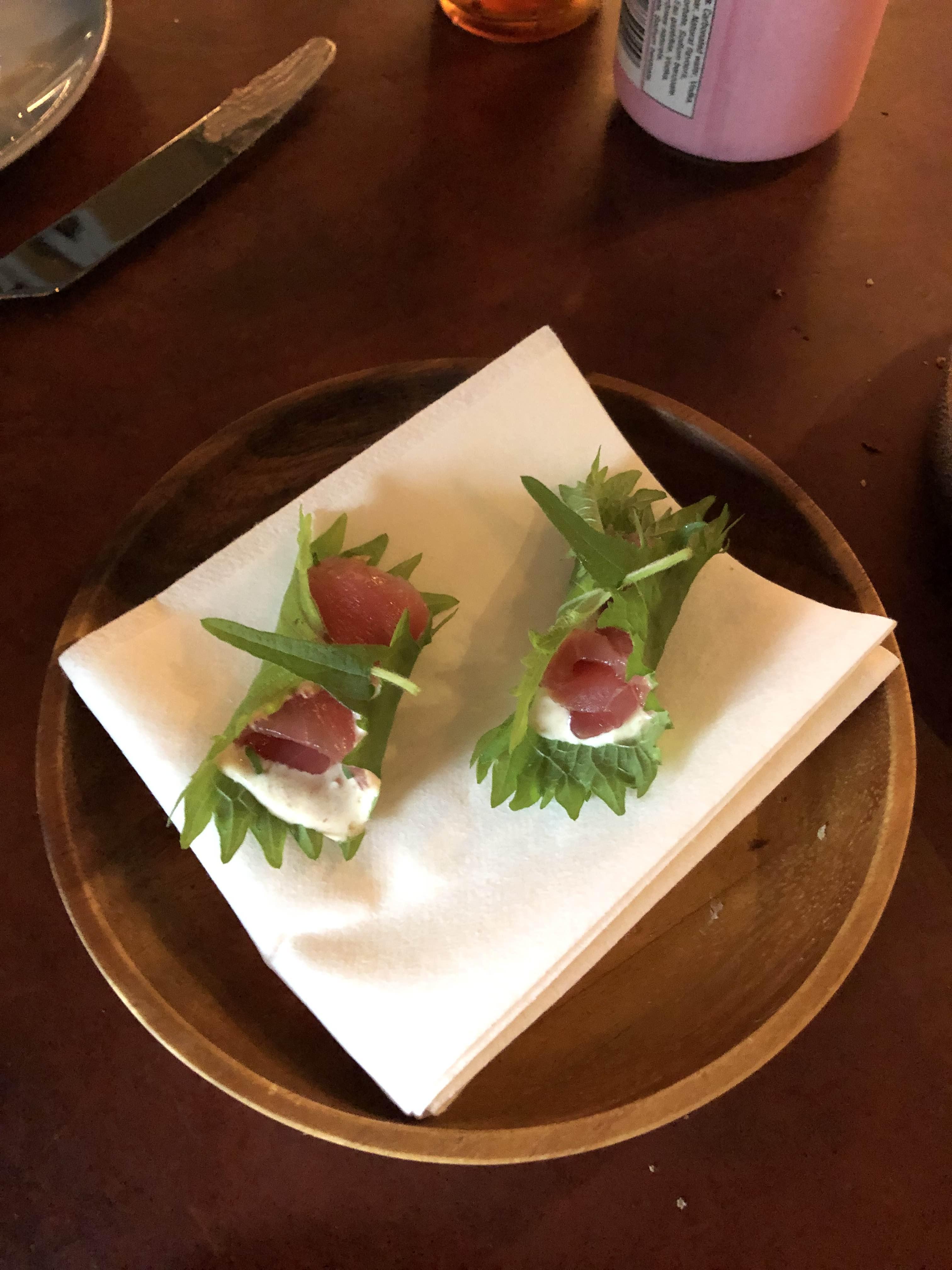 이건 튜나 타르타르였는데, 그냥 시소(Shiso) 잎에 드레싱 올리고 튜나 사시미가 올라 가 있었을 뿐. 일본 시소가 우리나라 깻잎이랑 향이 비슷한데, 개인적으론 평소 일식에서 시소 들어간 것도 별로 안 좋아하는 편이지만 이건 먹을만 했다.