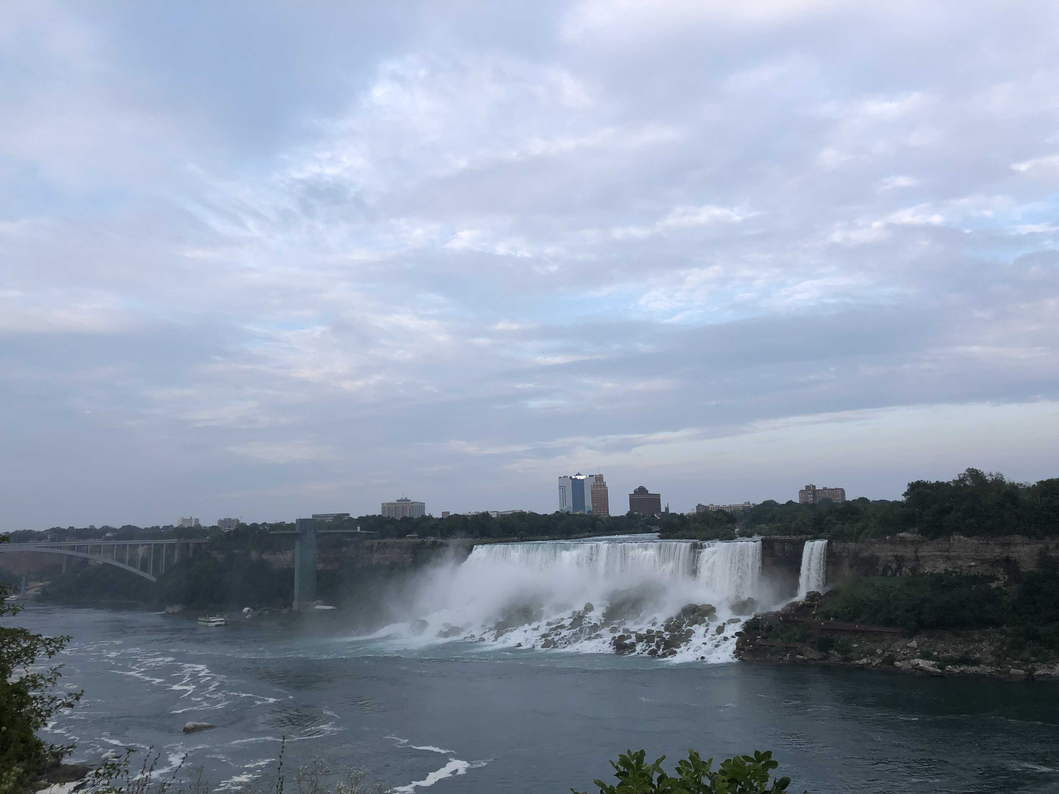 미국 쪽 나이아가라폭포. 예전에 왔을 때는 날씨가 좋아서 하늘이 너무 예뻤는데, 이번엔 날씨가 흐린 편이라 노을도 잘 안 보였다. 많이 덥지는 않았지만 바람이 불었던 날이라 걸어 다니면 폭포수가 흩날려와 샤워하는 기분. 이 전에 왔을 때도 느꼈지만 머리를 묶고 다니지 않고 사진을 찍으면 마치 비 오는 날 아침 출근길 헤어스타일이 나오니깐 가시는 여자분들 머리 묶고 걸어 다니시길 ㅎㅎㅎ