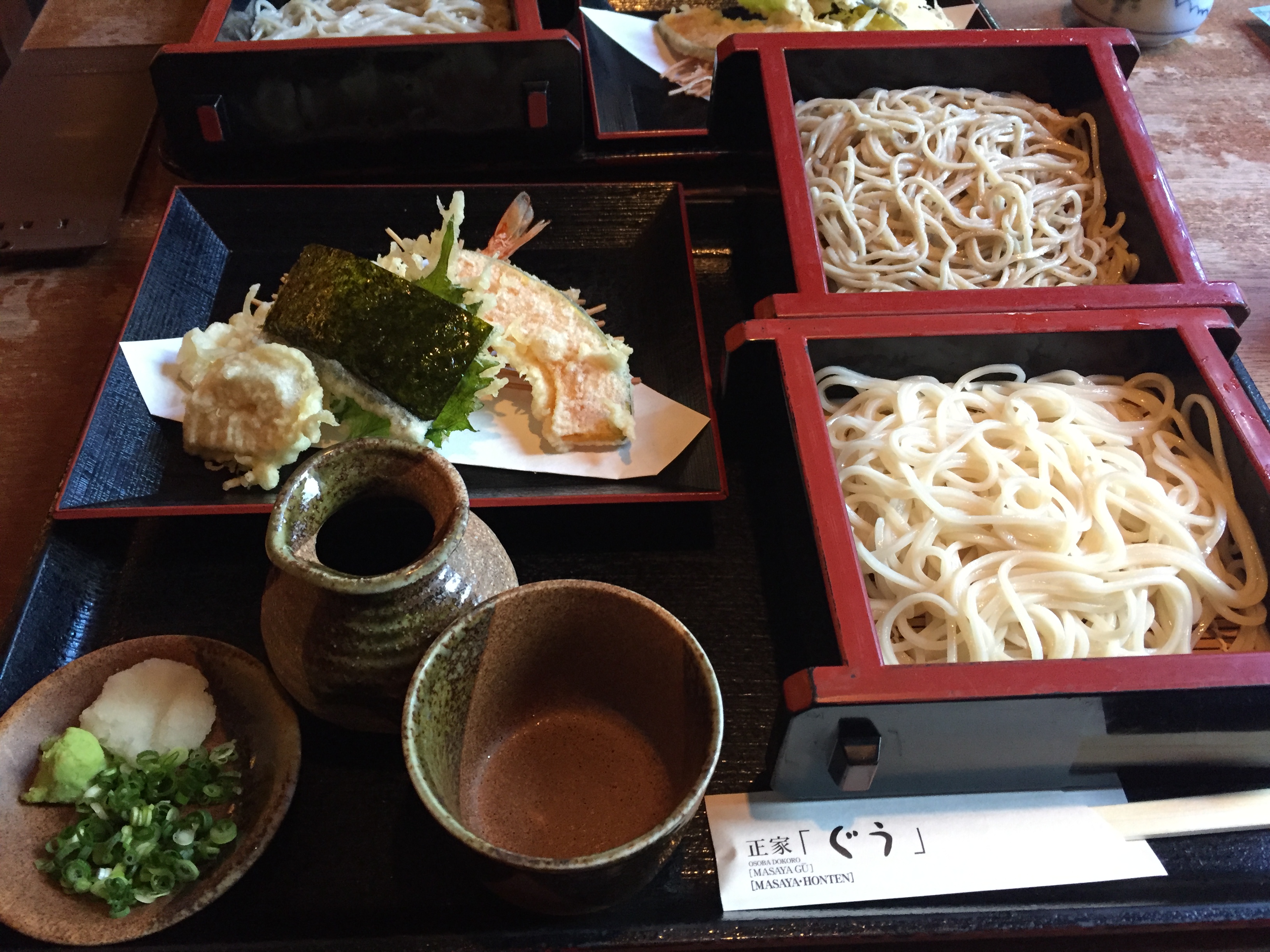 두 종류의 면이 따로 나오고, 튀김과 함께 와사비, 파, 다이콘 오로시에 소스까지 함께 이렇게 정갈하게 나왔다. 김이랑 깻잎 튀김도 있어서 신기하기도 했고, 배가 많이 고픈데 이런 걸 튀겨오면 어떡하냐며 웃으며 투정도 했던 것 같다.