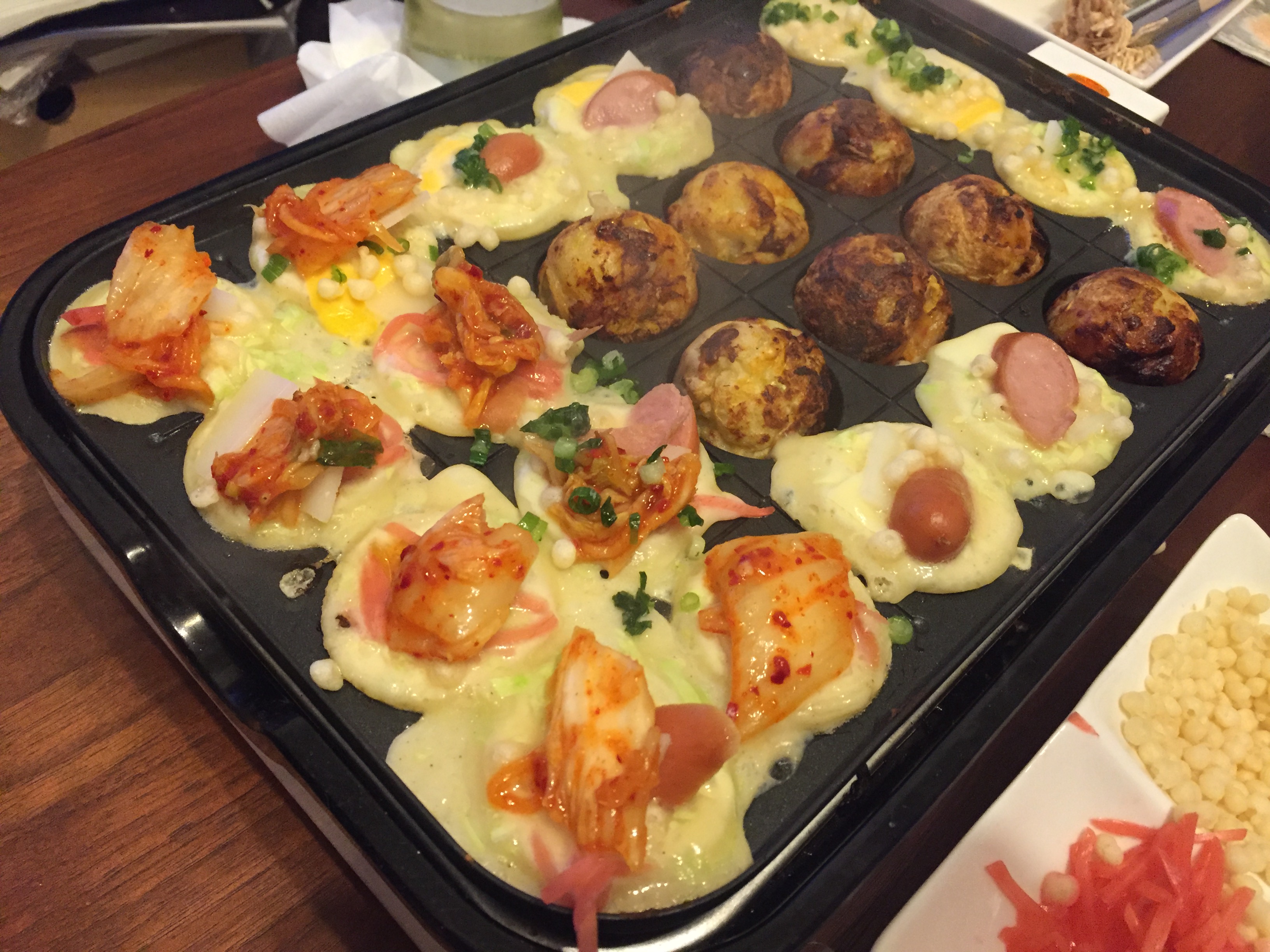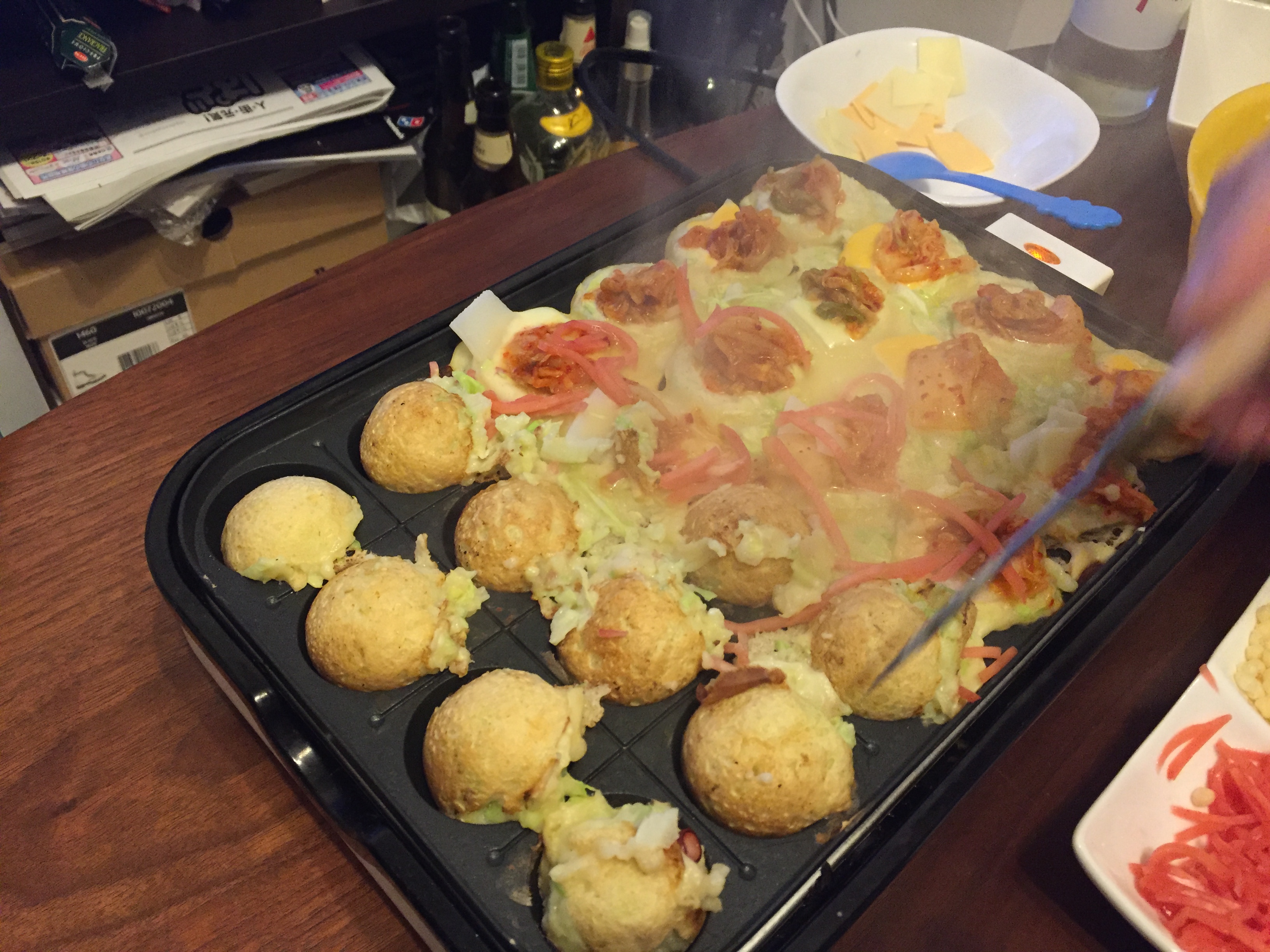 1차로 한번 먹어보고 맛있어서 2차로 김치에 소세지도 올려서 구워봄. 둘이서 맥주에 타코야키를 엄청 구워먹었더니 배가 너무 불렀던 이 날.