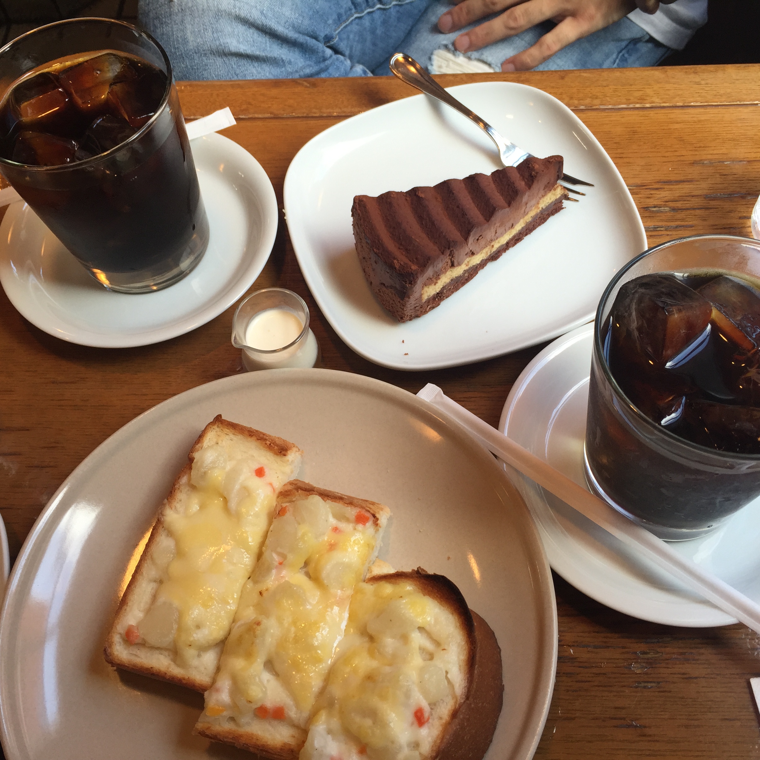 밥은 안 먹고 대신 마차 - 커피로 카페만 2번째 들른거라 각자 디저트도 함께 시켰다. 나는 감자토스트를 시켜봤는데 의외로 너무 맛있어서 깜짝 놀랐다.