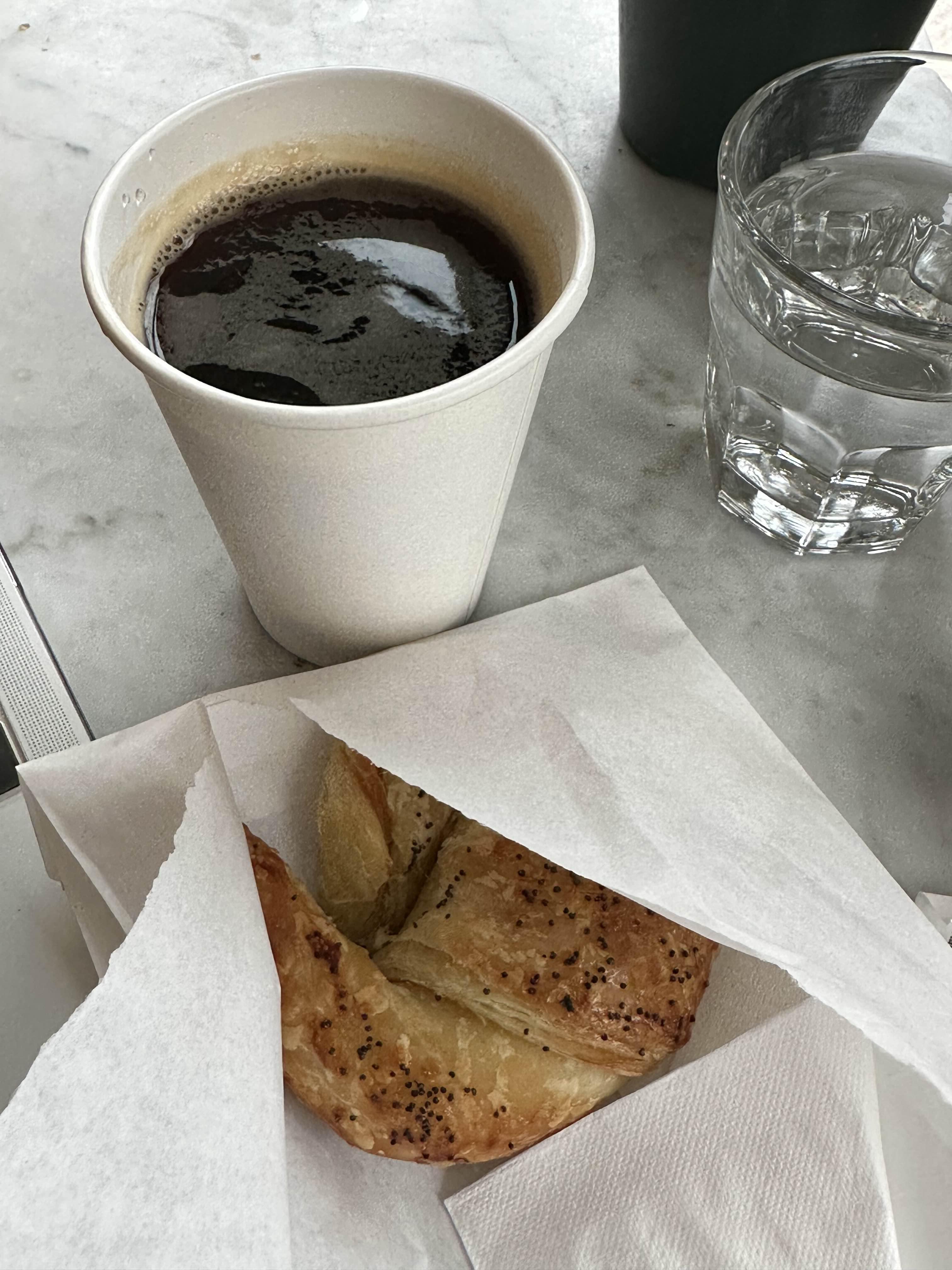 그렇게 아메리카노랑 리코타 치즈 & 어니언 크로아상을 주문했는데, 크로아상이 살짝 가격이 높아서 놀랐지만 일단 그냥 별 기대없이 시킨 디카페인 아메리카노 한모금 마셔보고 의외로 너무 맛있어서 눈이 번쩍.