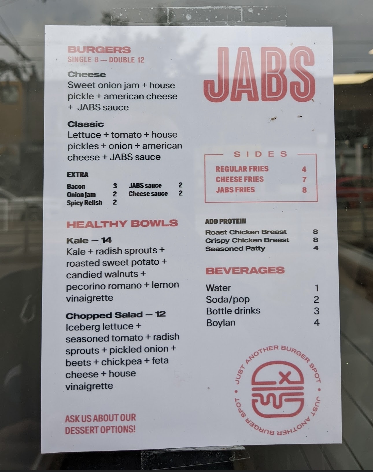 코로나 기간에 생긴 것 같은데 짧은 시간에 유명해진 JABS (Just Another Burger Spot)은 Smashed 패티를 쓴 수제 버거로 유명하다. 싱글, 더블 패티 중 선택할 수 있고 양상추와 토마토가 들어가는 클래식과 치즈 버거 중 선택할 수 있다.