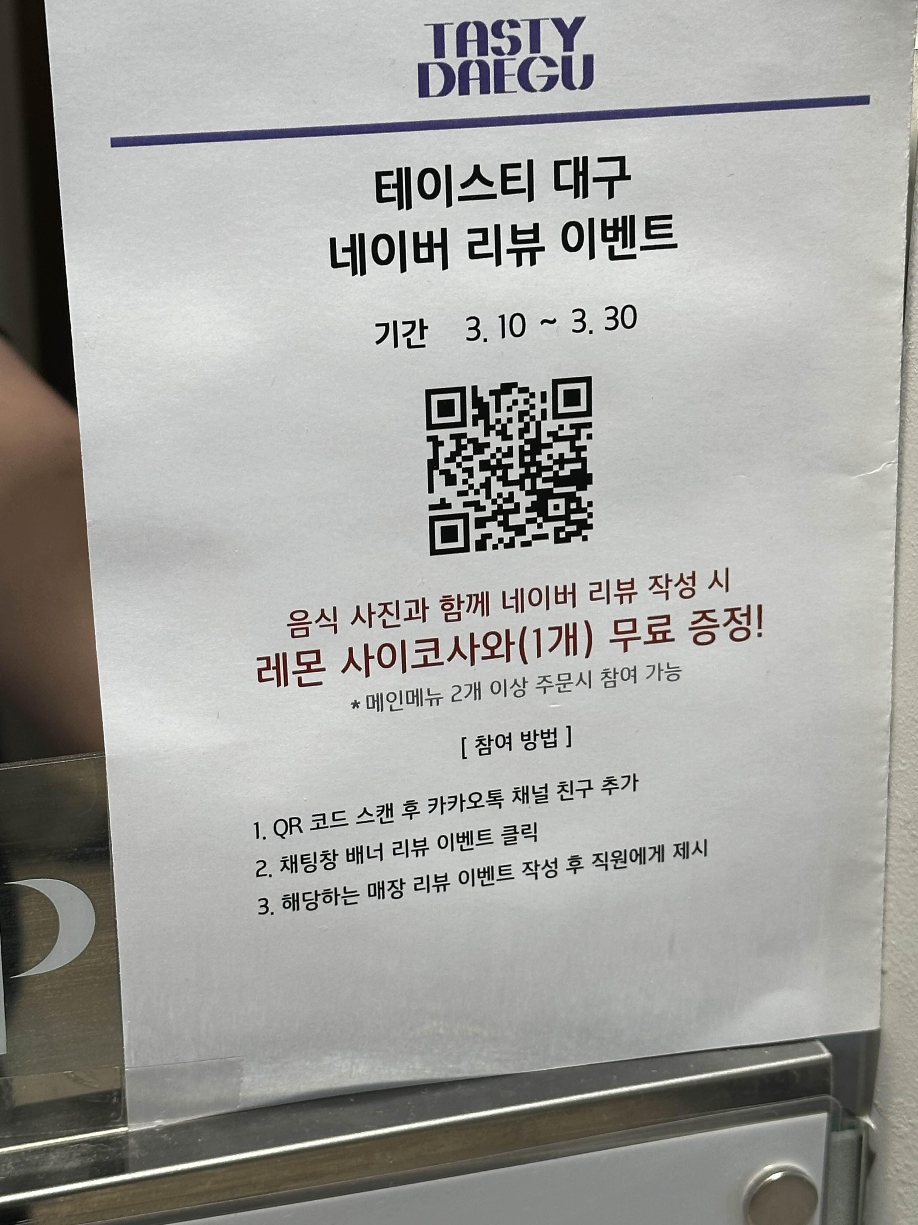 현재 배키욘방에서 메인메뉴 2개 이상 주문하면 레몬 사이코사와를 주는 리뷰 이벤트가 진행중이라, 캐나다 사느라 이런거 잘 모르는 나도 물어가며 열심히 리뷰를 작성했다ㅎㅎㅎㅎㅎ 별거 아닌거지만, 무료로 준다니 사람이 이렇게나 적극적이 되다니;;