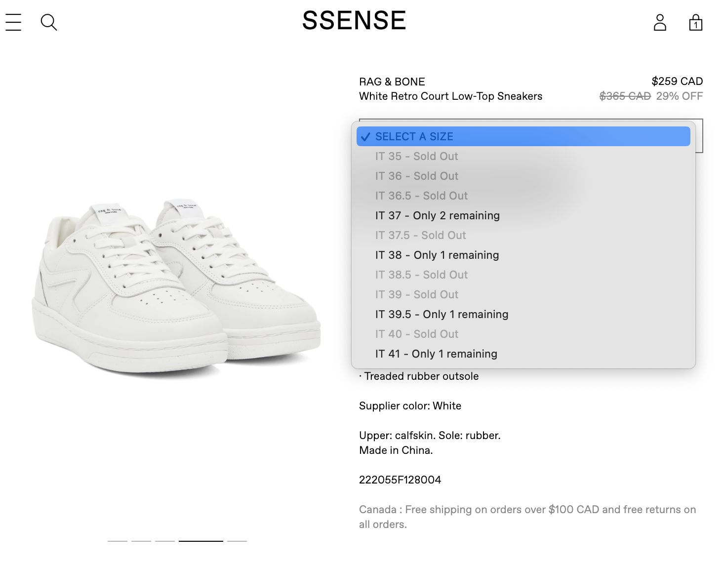 그러다 오늘까지도 고민하면서 그냥 정가에 질러버려? 하고 고민하며 검색하던 차에 띠용! ssense에서 30% 세일이 들어가있는 게 아닌가??? 오늘부터 시작된건가????? 운도 좋지 어쩜 이렇게 딱 세일이 들어간 날 생각나서 검색을 해보다니... 게다가 내 사이즈가 아직 남아있다!!!!