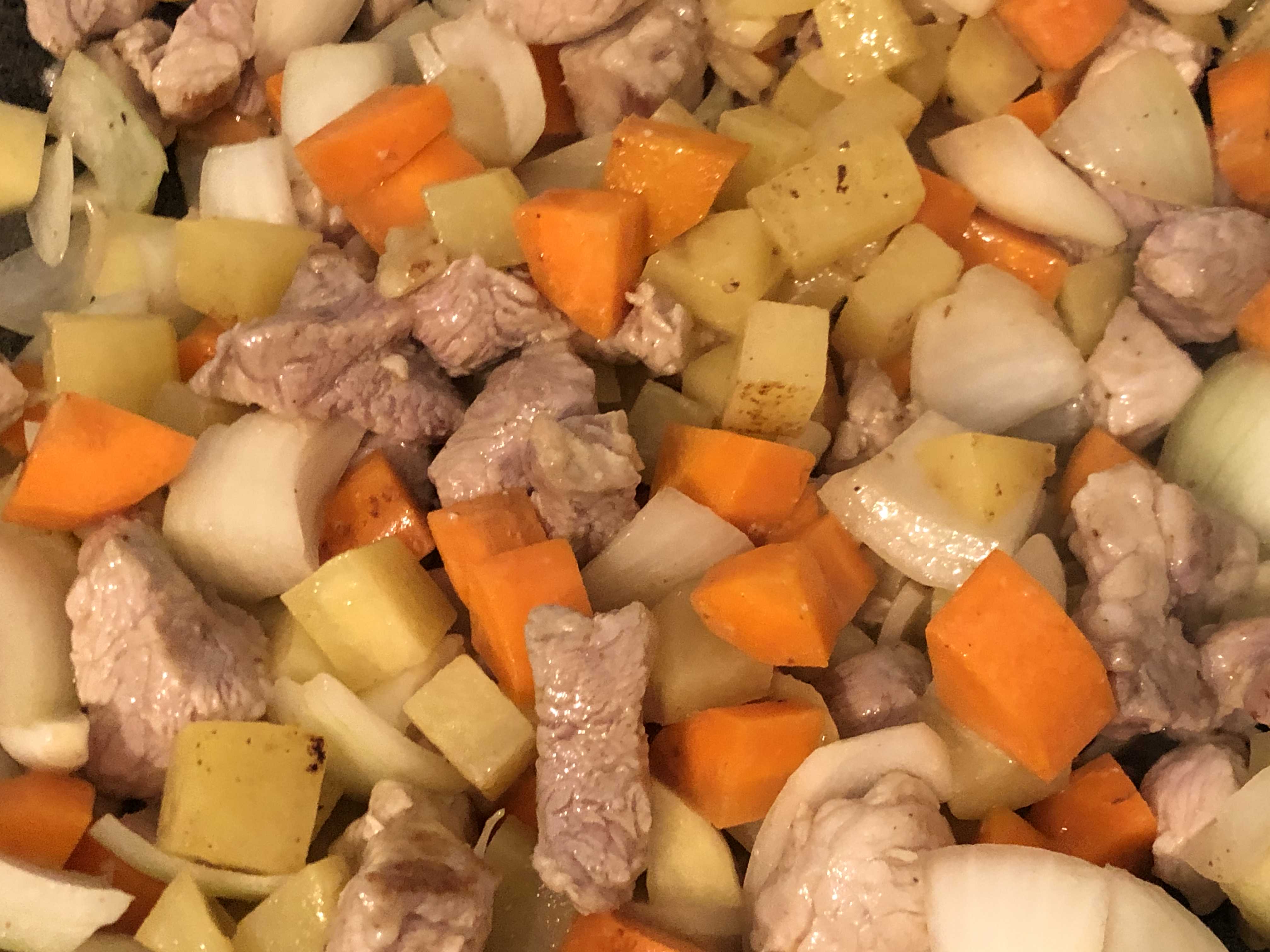 1. 식물성 오일을 넣고 돼지고기, 감자, 당근, 마늘을 먼저 볶는다. 이때 양파를 같이 넣어도 되지만 나는 양파 식감이 조금은 살아있었으면 좋겠어서 다른 거 먼저 한번 볶고 나서 양파를 나중에 넣었다.