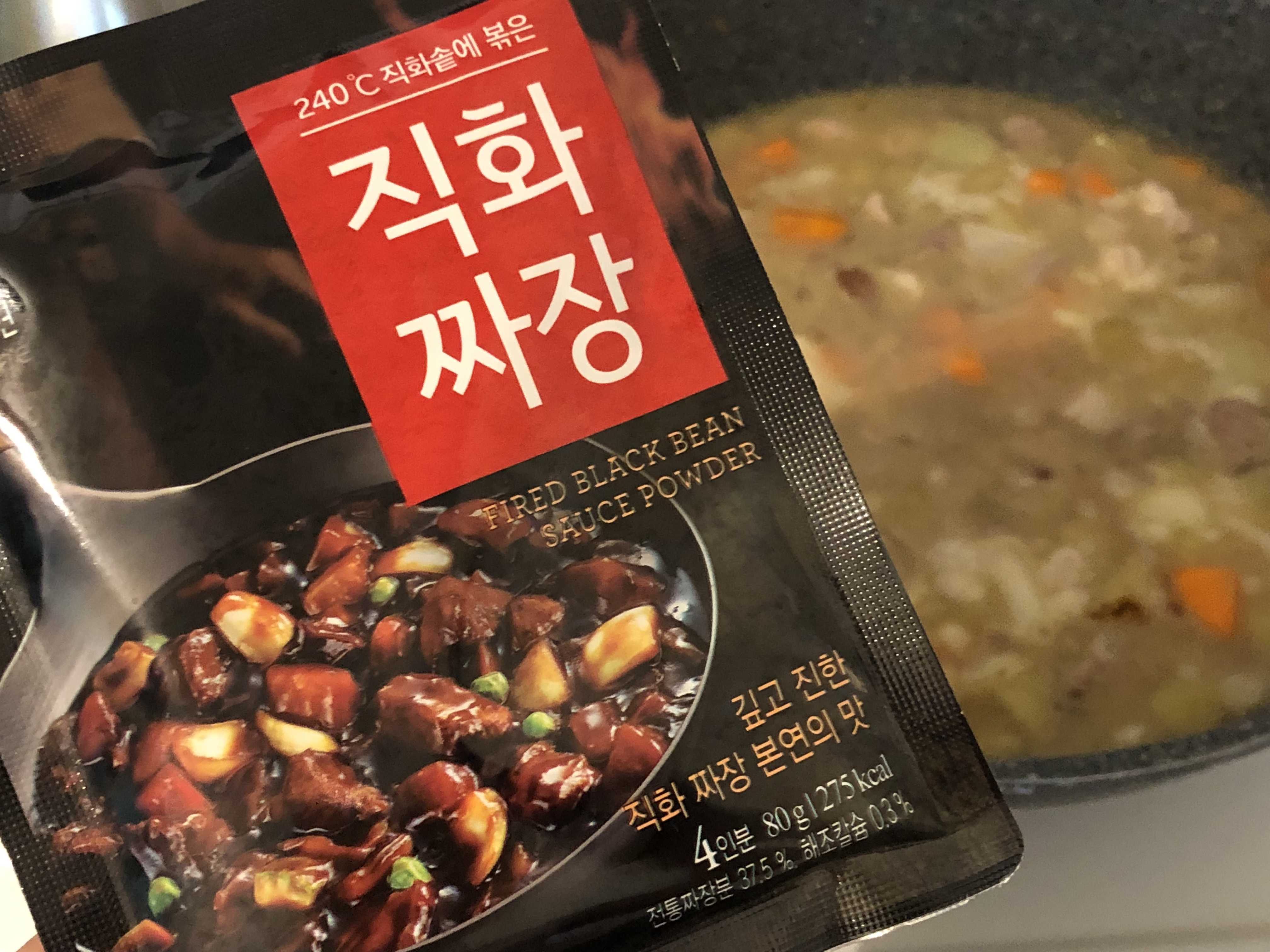 4. 센불에서 어느 정도 끓이고 나면 불을 약불로 줄이고 짜장 가루를 조금씩 넣어서 풀어준다. 한국 마트서 사온 청정원 직화 짜장 가루.
