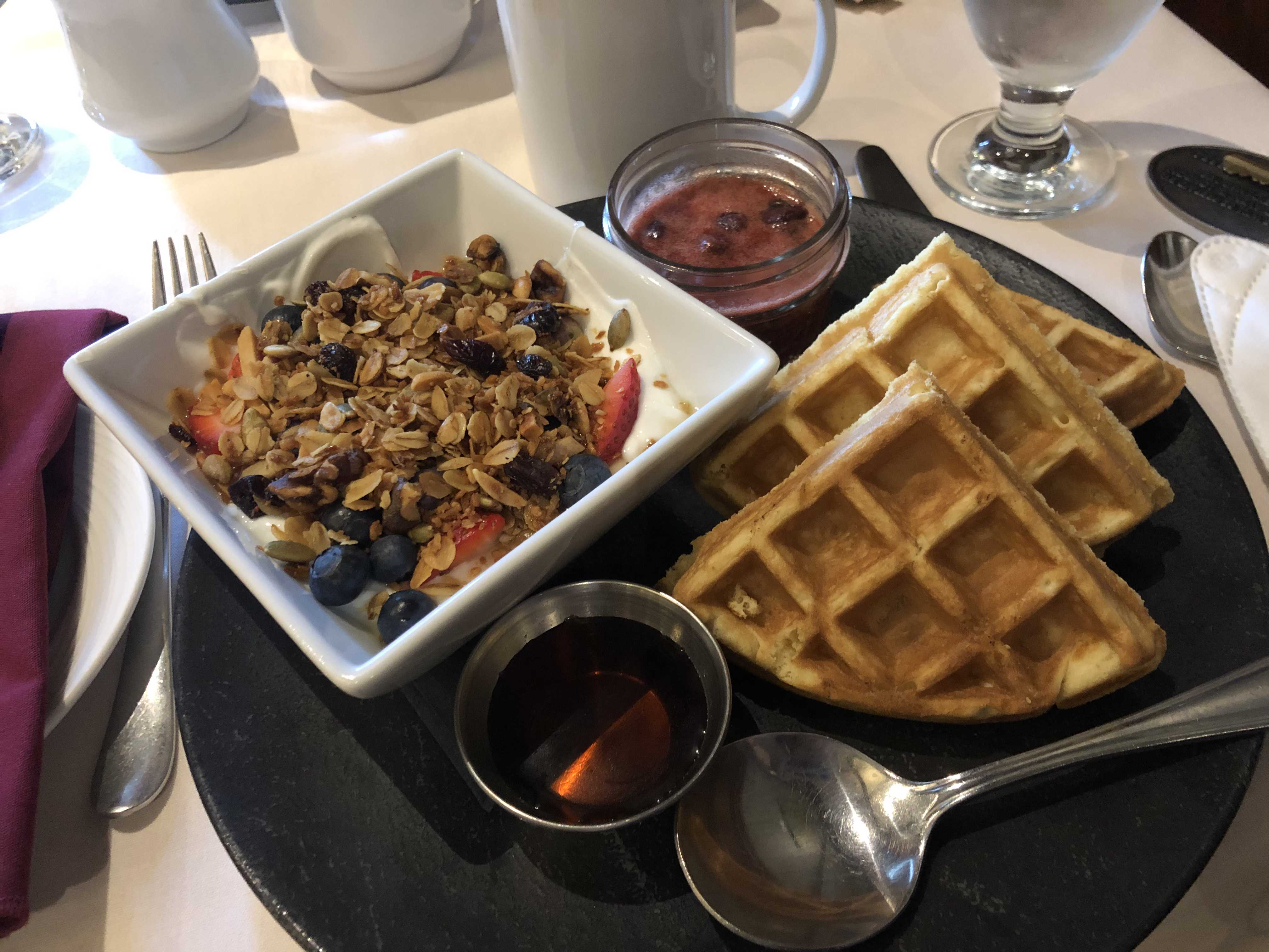 그냥 사 먹으면 $13.95 인 내가 주문한 Yogurt Parfait & Berry Compote Waffles. 이때까지만 해도 비몽사몽이었는데, 따뜻한 커피에 와플이랑 과일과 house-made 그레놀라가 들어간 요거트를 먹으니깐 잠이 깼다.