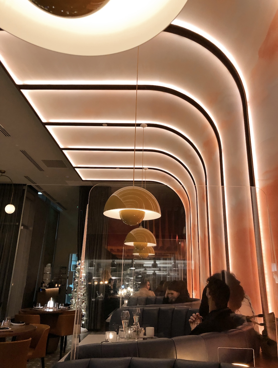 일찌감치 예약을 해둔 덕에 핑크빛 벽면 아래에서 식사를 할 수 있었는데 조명 하나는 정말 예뻤다. 천장에 달린 램프도 매번 제대로 청소를 하는지? 반짝반짝 광이 날 정도로 깨끗하고 예뻤다ㅎㅎㅎ 이 원형 소파가 있는 테이블은 인원은 두명 이상이면 예약이 가능하지만 총 다섯 테이블 밖에 없기 때문에 이 자리로 원한다면 꼭 미리 예약을 할 것을 추천한다.