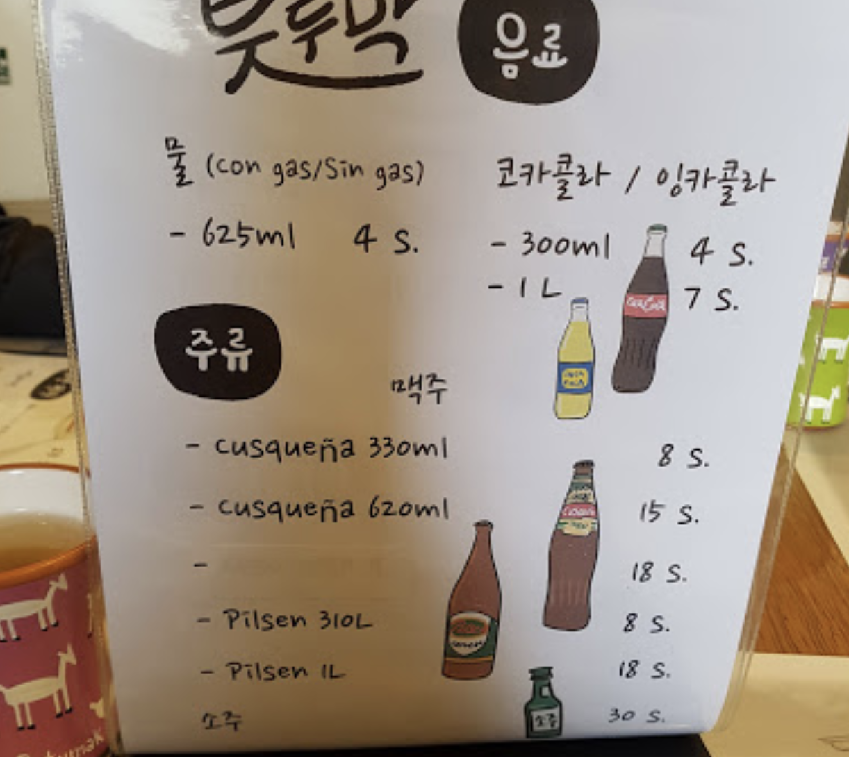 여기가 한국인가 싶을 정도로 정말 깨끗하고 깔끔했던 인테리어. 카운터 계시던 사장님은 젊은 한국분이셨는데 마침 전날 마추픽추 갔을 때 마주쳤던 한국어 가이드로 계셨던 분이 카운터에 계셔서 깜짝 놀랐다. 20대 후반 - 30대 초중반 정도의 나이대인 것 같은데 어떻게 페루에, 그것도 쿠스코에서 한식당을 하며 지내시는지 궁금해서 이런저런 이야기를 나누고 싶었지만 너무 바쁘셔서 인사만 나눴다. 서빙하는 분들은 현지 페루인들이었는데, 메뉴가 크게 복잡할 것도 없고 영어가 통해서 불편함은 없었다.