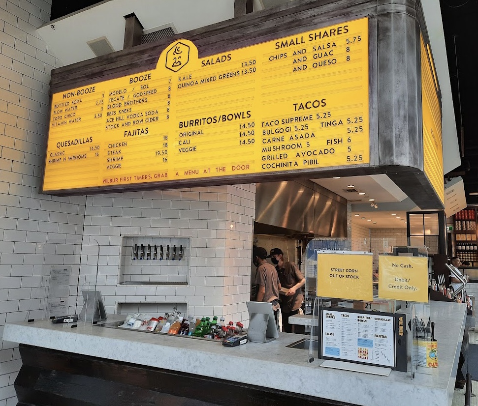 실내는 이런 모습. 몇 달 전인지 가격이 오르기 전 메뉴가 보인다. 이렇게 넓고 깨끗한 곳인데 빨리 다이닝도 오픈을 해서 실내에서 먹을 수 있는 날이 빨리 왔으면 좋겠다. 케사디야는 따뜻할 때 먹어야 제 맛이니깐. 다운타운 사시는 분들에게 꼭 추천하고 싶은 멕시칸 맛집 Wilbur Mexicana.