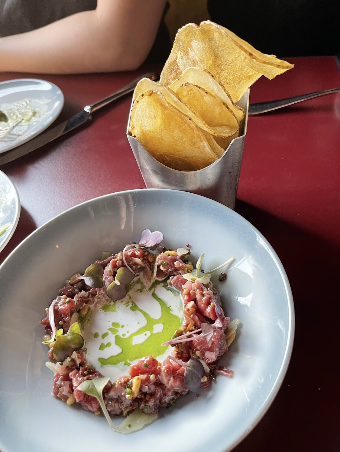 그리고 마지막 디쉬는 비프 타르타르. 이것도 미리 친구에게 추천받아 기대하고 시켰는데, 사진으로 봤던 비주얼과는 조금 달라서 의아했던 차에 우리 서버가 설명해주기를, 최근에 레시피를 바꿔서 맛도 플레이팅도 바뀐거라고. 치즈가 많이 올라가 있기도 하고 드레싱이 내 입맛엔 좀 시큼한 감이 있었는데, V는 이것도 너무 맘에 든다며 맛있게 잘 먹음.