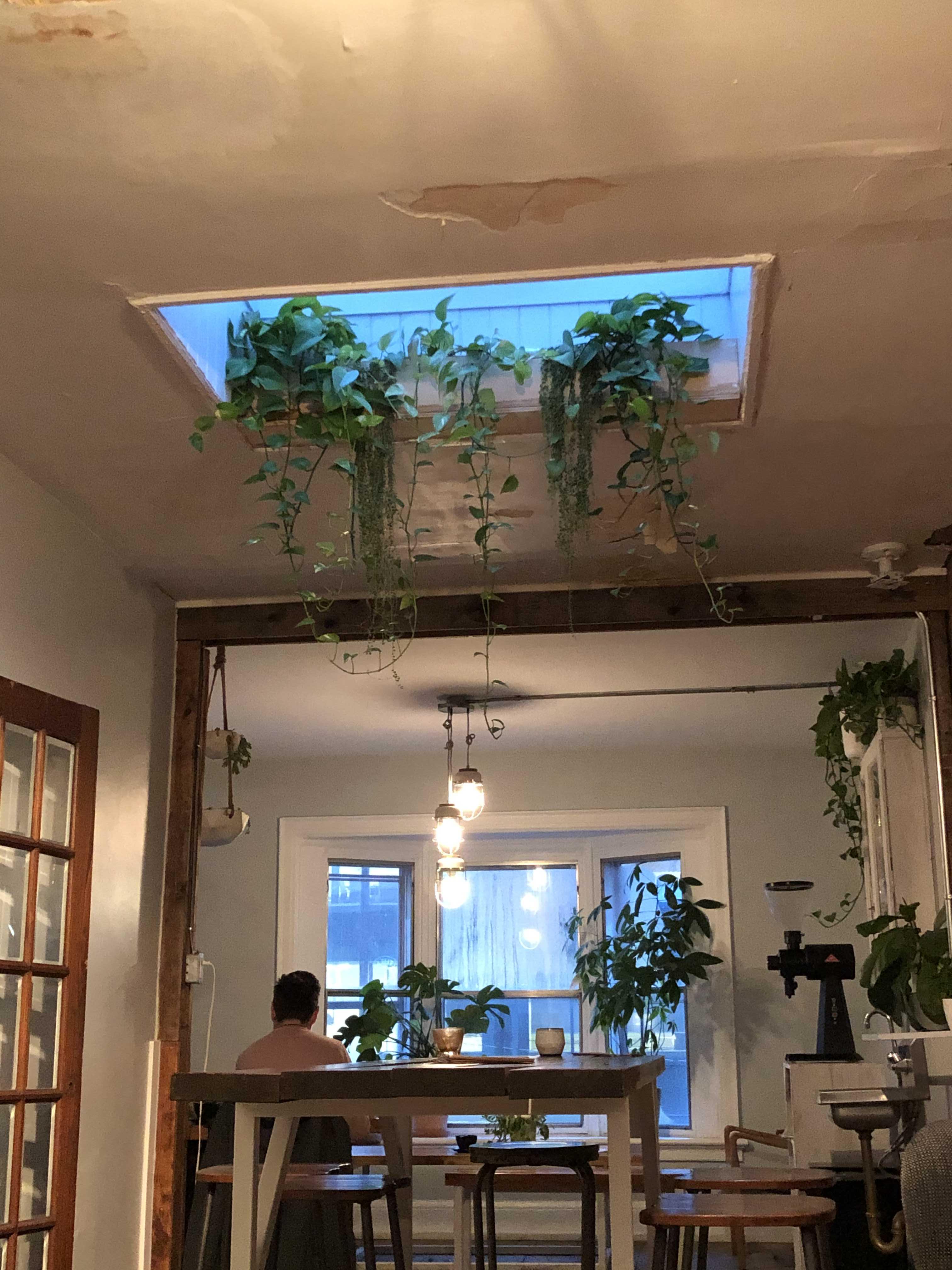 크게 많은 걸 두지는 않았지만, 나무 테이블과 의자, 이곳저곳에 놓인 식물들로만으로 충분히 예쁜 이 공간.