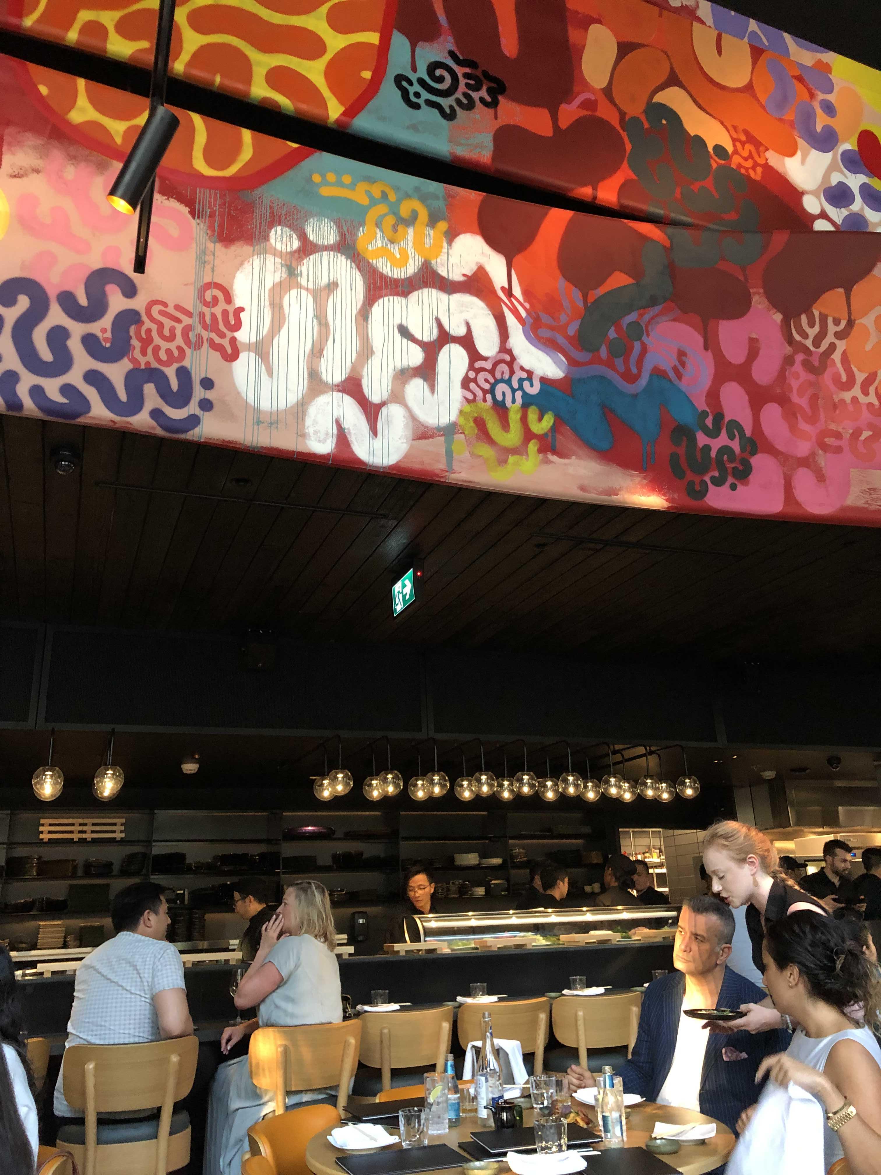 아래 사진들에서 알 수 있듯이 들어가자마자 높은 2층 벽에 그려진 아트가 정말 화려함. 실제로 이름은 잊어버렸지만, 한 아티스트가 오랜 기간 작업한 벽인데 멀리서 보면 대단해 보이고 가까이서 보면 조금 난해하기도 한 인테리어ㅎㅎㅎ 이날이 금요일 디너타임이기도 했지만 당시 정말 오픈한 지 얼마 안 됐었기 때문에 모든 테이블이 만석이었다!