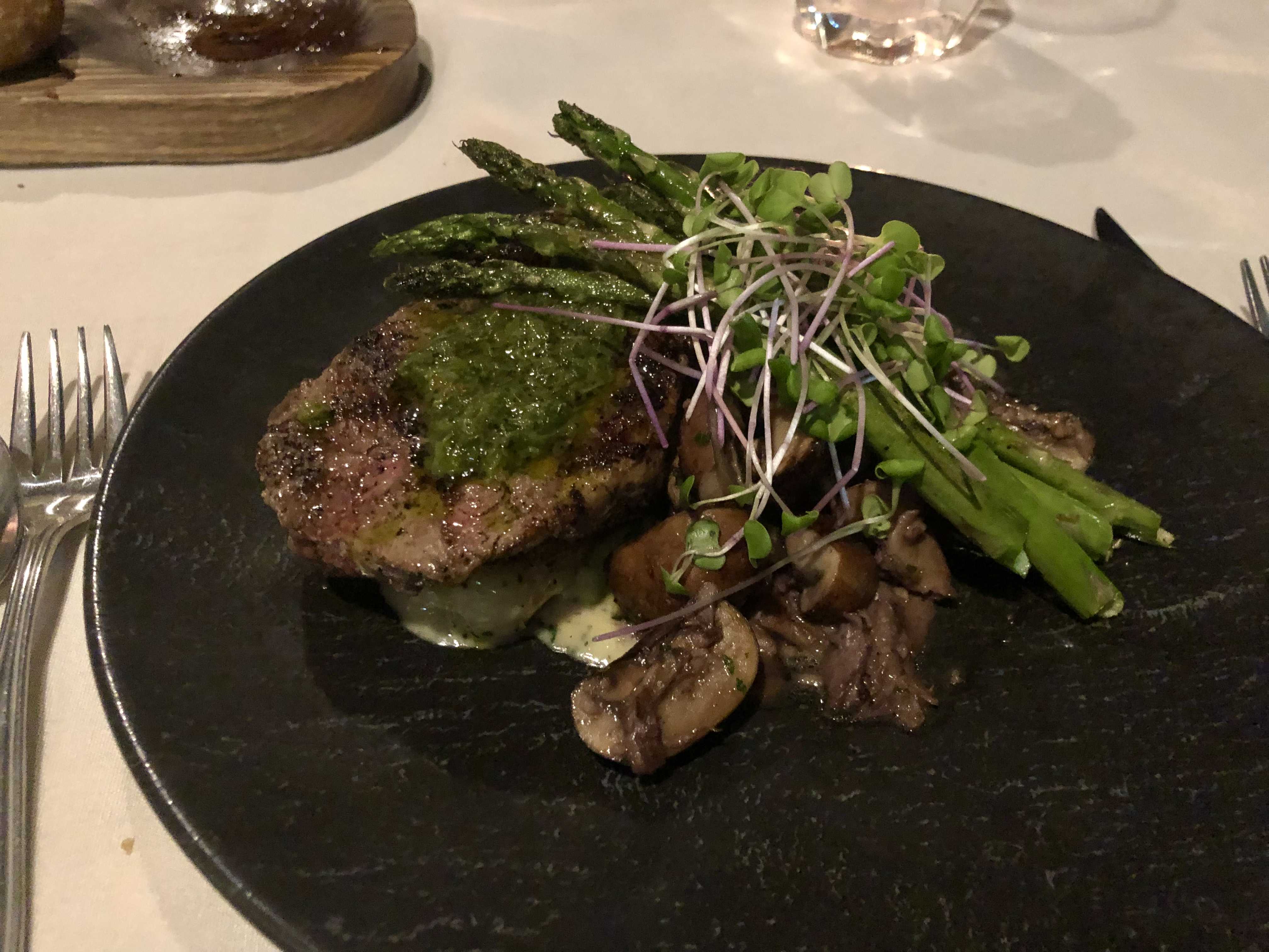 내가 시킨 Grilled New York Striploin. 몇 oz인지 안 나와있어서 몰랐는데, 스테이크가 엄청 커서 우리 둘다 놀랐다. 맛은 괜찮았는데, 플레이팅이 맛보다 훨씬 훌륭한 듯 (데브리 맛집 카테고리에 못 들어가는 이유ㅎㅎㅎ).
